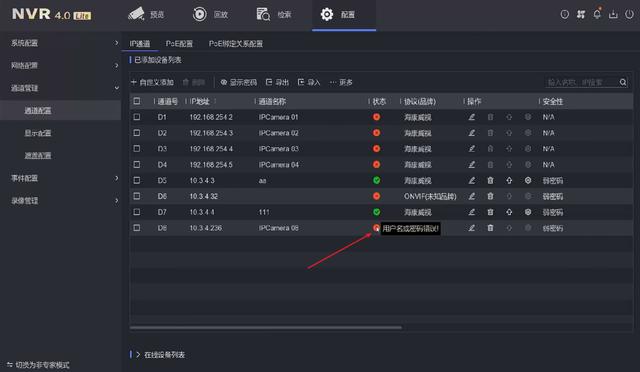 进入“配置→通道管理→通道配置→IP通道”,选择报错“用户名或密码错误”的监控点,点击右边“操作”按钮。