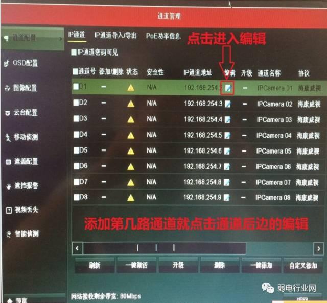 6.进入通道管理要添加哪一路通道就点击默认Ip后边的编辑,进入编辑添加设备。