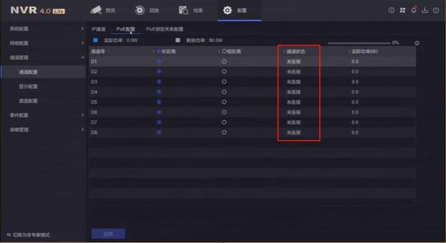 NVR4.0 Lite系统的PoE录像机,当切换为专家模式后,会多出PoE配置、PoE绑定关系配置菜单项。