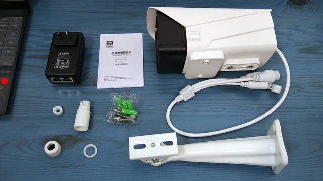 整盒产品主要有摄像头、说明书、POE适配器、防水胶头组件*4、支架安装包和金属安装支架。