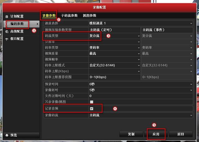 2.在录像配置—编码参数,码流类型选择成复合流,记录音频打钩 ,点击应用。