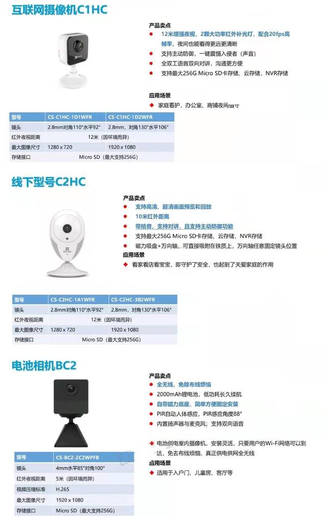 以上是萤石室内卡片机C1HC、C2HC、BC2等规格。卡片机是wifi连接,不能控制镜头转动的家用型摄像头,其镜头视角一般较大(焦距长为1.68mm或2mm),支持双向语音对讲,同时带红外夜视,夜间也能实现监控。其中BC2较为特殊,内置锂电池,可以在不方便布线接电的场景下使用。