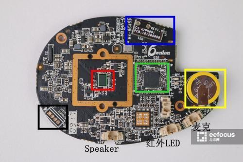 萤石 C2c 摄像头的电路方案芯片级的集成度非常高,因此从拆解的 PCB 主板来看硬件电路设计倒显得比较简洁,硬件功能布局相当传统,除主 PCB 板之外的一些额外功能都通过接插件连接器扩展到摄像头外壳上,如红外 LED、Speaker、麦克。