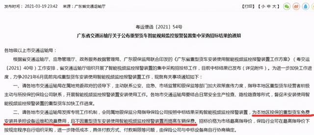 3月19日,广东省交通运输厅发布了粤运便函〔2021〕54号文件,公布了招标结果。同时再次强调了保险公司不因重型货车安装使用智能视频监控设备装置而提高车辆保费,要为本地区投保的车辆免费安装并承担设备运维和流量费用。