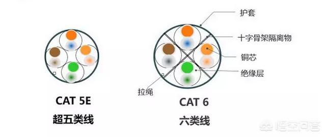 六类网线是超五类网线的升级版,最根本的区别是双绞线2根线芯的绞合度不一样,六类双绞线的绞合度比超五类的要求高,且六类网线中间还有十字骨架。