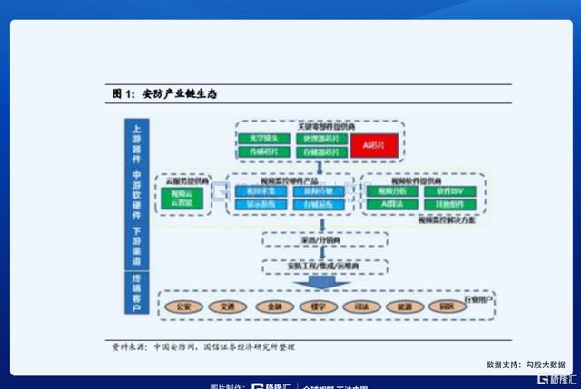 经过多年快速发展,安防行业走向成熟,形成了完整的产业链:上游包括基础零组件、芯片和算法;中游包括设备、设备配套软件以及输出数据的云服务部分;下游则包括产品、系统集成、工程和运营服务等环节,海康威视为代表的安防厂商从设备端到系统集成以及运营均有覆盖,从传统硬件到软件及解决方案横向拓展。
